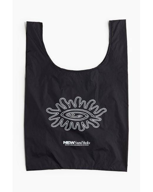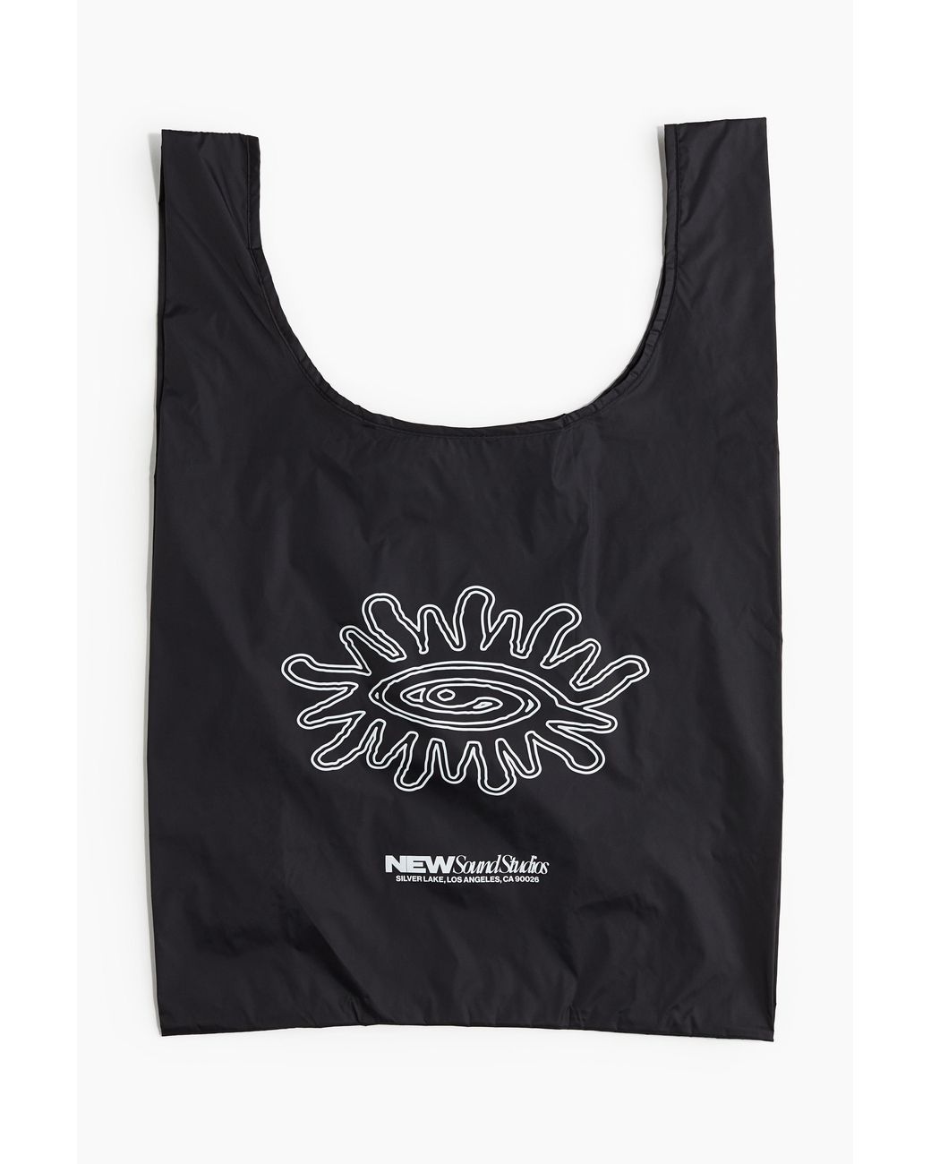 Ein Shopper aus bedrucktem Nylon, der bei Nichtgebrauch zusammengefaltet und in der Innentasche verstaut werden kann. Breite 38 cm. Höhe 60 cm. Farbe: schwarz