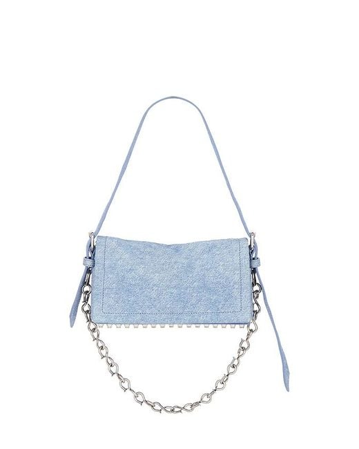 Alexander Wang Ricco Crushed Slim Flap Bag in Blue. Alexander Wang Ricco Crushed Slim Flap Bag in Blue. 100% goatskin leather denim printed exterior with polyester lining. Imported. Hidden magnetic flap closure. One main compartment. One interior zipper pocket and one interior card slot pocket. Metal stud detailing at base. Removable straps. Measures approx 9.8 W x 5.1 H x 1.7 D Shoulder strap with a 36.6 drop Crossbody strap with a 62.2 drop. AWAR-WY160. 20126R58L. Alexander Wang adds measured depth to his signature tough-sexy pieces using a sultry scarlet and feminine blush alongside his favorite black and grey hues. Expect luxe hybrids of your favorite outerwear as well as layers, chunky knits, and sleek satins in this collection. Colour: blue