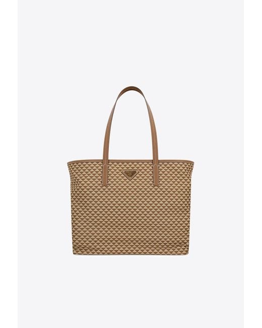 Material: 100% recycled polyamide, 100% leather. Open top. Double top handles. All-over triangle print. Enamelled metal triangle logo on the front. Single compartment. Inner zip pocket. Inner flat pocket. Gold-tone hardware Colour: natural