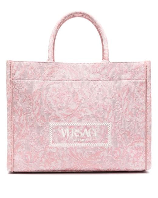 Pale pink signature Barocco print tonal stitching leather panel detail logo-engraved gold-tone hardware embroidered logo to the front internal logo patch no fastening two rolled top handles main compartment internal zip-fastening pocket leather feet unlined Size: One Size. Gender: Unisex. Material:Nylon/Acrylic/Cotton/Calf Leather/Polyester.