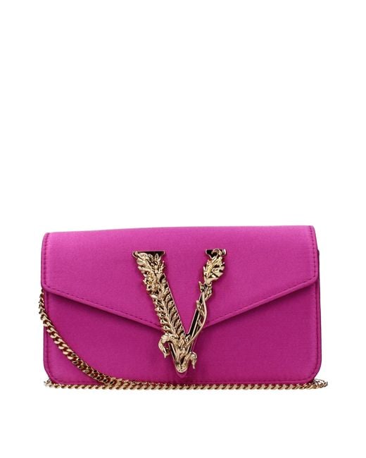 The item with MPN 10133561A086681PO3V and code F85543 in satin of colour fuchsia belongs to the clutch category by designer Versace. It features characteristics such as front logo, removable strap. Colour: purple
