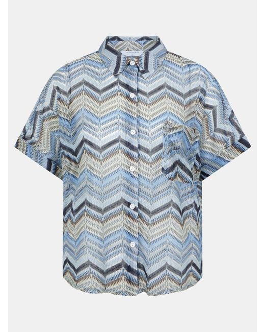 A day by the pool? Always. Patterned with zigzags in beachy hues, this crochet shirt is a suitcase staple. Designed with a classic collar and short sleeves, style over a bikini or with breezy linens. Can't get enough of the print? Double up with the matching shorts. Machine washable. 98% Polyester, 2% Metallised fibre. Colour: blue