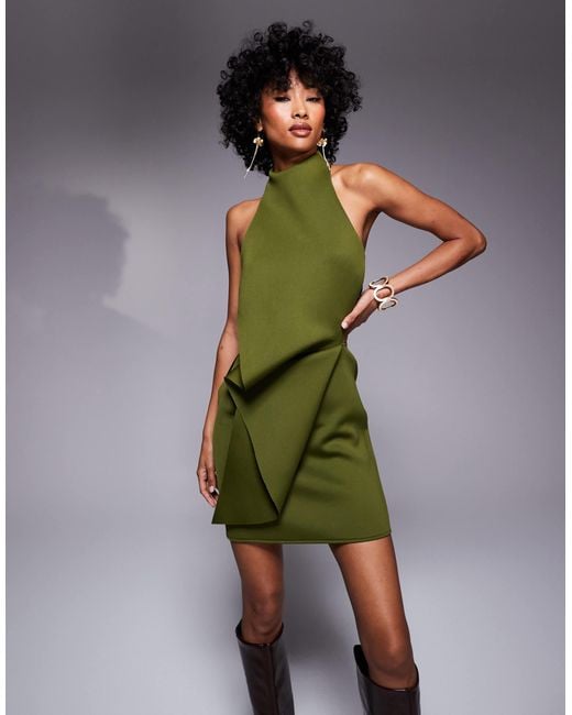 Women's Green Mini Dress With Halter Neck And Fold Back Detail