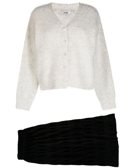 Black/white stretch-design Jacket: knitted construction brushed effect faux-pearl buttons V-neck front button fastening drop shoulder long sleeves straight hem Skirt: fully pleated velvet elasticated waistband A-line mid-length straight hem Size: XS. Gender: Female. Material:Polyamide/Cotton/Spandex/Elastane/Polyester/Acrylic/Other fibres/Polyester/Wool. Colour: white