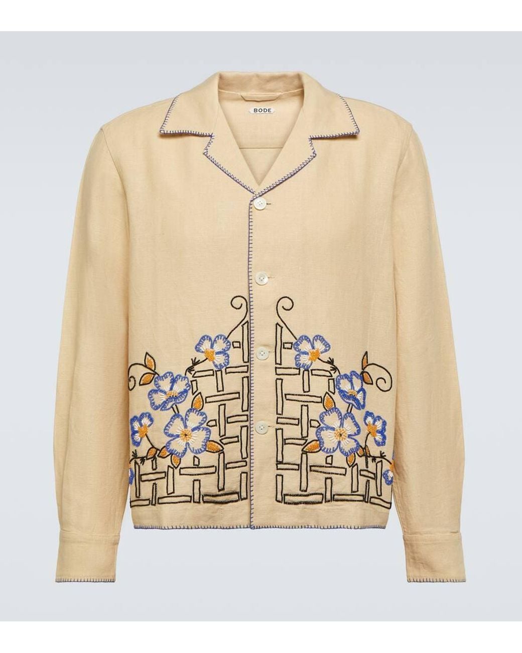 Material: 100% linen. Care instructions: dry clean. Made in India. Designer colour name: White Multi. Closure: buttoned front. Cuff: one button. Oversized fit. Collar: Cuban. French front (no front placket). Hem: straight. Linen. Colour: natural