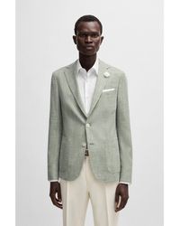 Go to HUGO BOSSBlended with virgin wool, cotton and linen, this micro-patterned BOSS Menswear blazer is a characterful formal option. The slim fit features softly constructed shoulders. Colour: blue