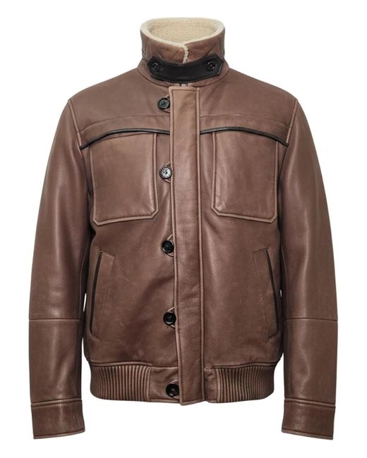 Brown button fastening ribbed hem chest pockets Size: XL. Gender: Male. Material:Calf Leather. Colour: brown