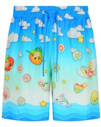 Go to BaltiniCasablanca silk Bermuda shorts make a bold statement, blending casual style with luxury. Made from rich black silk, the shorts showcase a gradient blue hem featuring a whimsical 'Blades' pattern. An elasticated waistband