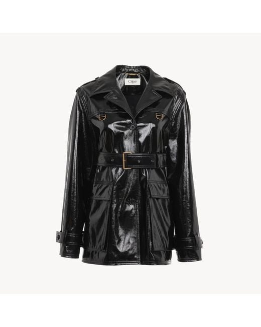 Belted jacket in shiny coated cotton, featuring maxi flap pockets, engraved horn buttons and gold-tone hardware. Colour: black