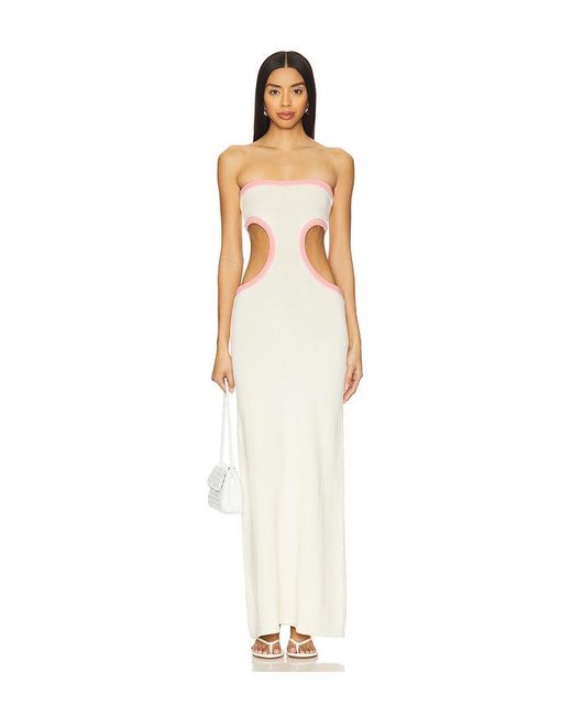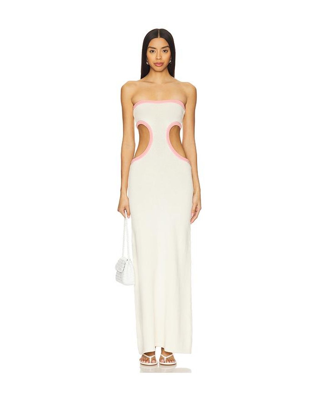 Cin Cin Empire Knit Dress in White. Size L. Also in XL. Cin Cin Empire Knit Dress in White. Size XL. 50% cotton 50% elastane. Made in Indonesia. Hand wash. Unlined. Pull-on styling. Midweight knit fabric. Back and side cut-outs. Neckline to hem measures approx 54 in length. CCIN-WD34. S1083.