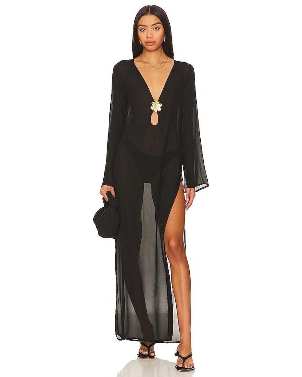 Cin Cin Hotline Maxi Dress in Black. Size L. Also in M, XL, XS. Cin Cin Hotline Maxi Dress in Black. Size M, XL, XS. 100% viscose. Made in Indonesia. Hand wash. Unlined. Pull-on styling. Detachable gold-tone floral brooch at bust Lightweight chiffon fabric with side seam split. Garment is intentionally sheer, undergarments will show through. Please note undergarment not included. CCIN-WD14. S0486.