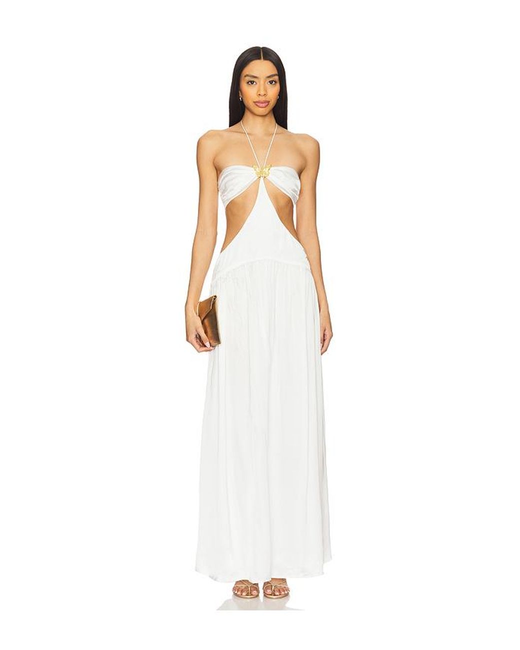 Cin Cin Mila Butterfly Maxi Dress in White. Size L. Also in M, S. Cin Cin Mila Butterfly Maxi Dress in White. Size M, S. 100% viscose. Made in Indonesia. Hand wash. Unlined. Halterneck and back tie closures. Side and back cut-outs. Satin fabric with subtly flounced hem and detachable gold-tone butterfly charm at bust. CCIN-WD32. S1075.