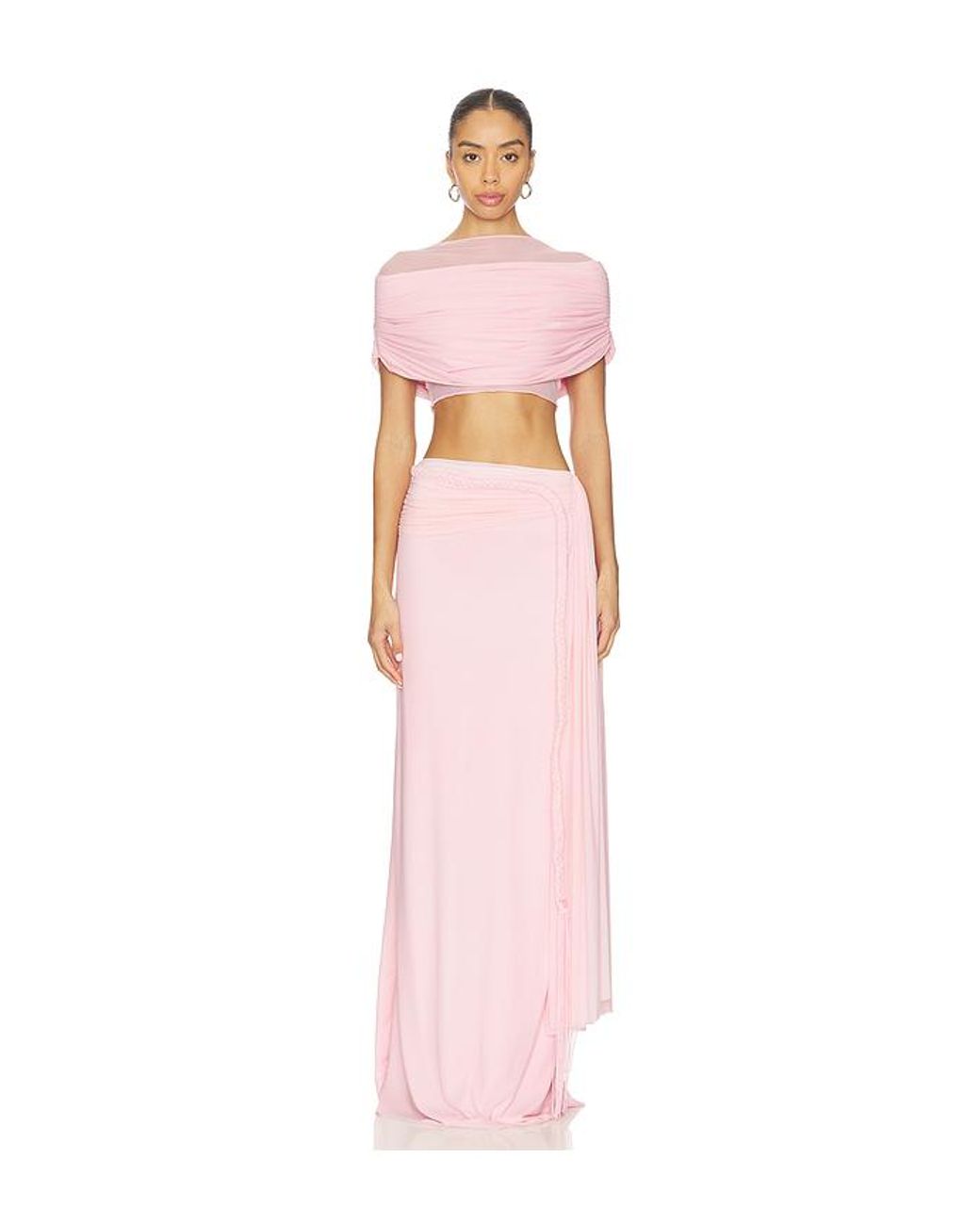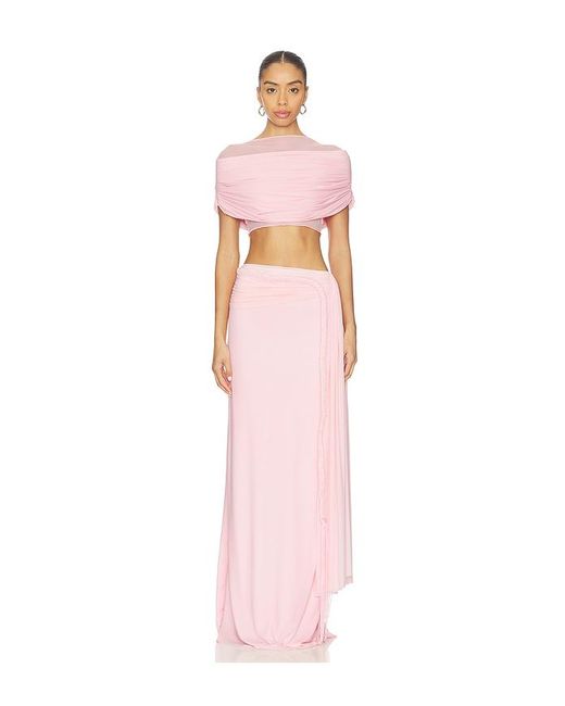 Deme by Gabriella Alyssa Dress in Pink. Size L. Also in M, S, XS. Deme by Gabriella Alyssa Dress in Pink. Size M, S, XS. 80% nylon 20% lycra. Made in India. Dry clean only. Fully lined. Pull-on and side zipper closure. Two-piece dress with exposed midriff. Ruching and braided strap detail. DEBY-WD80. DBG_CP_005.
