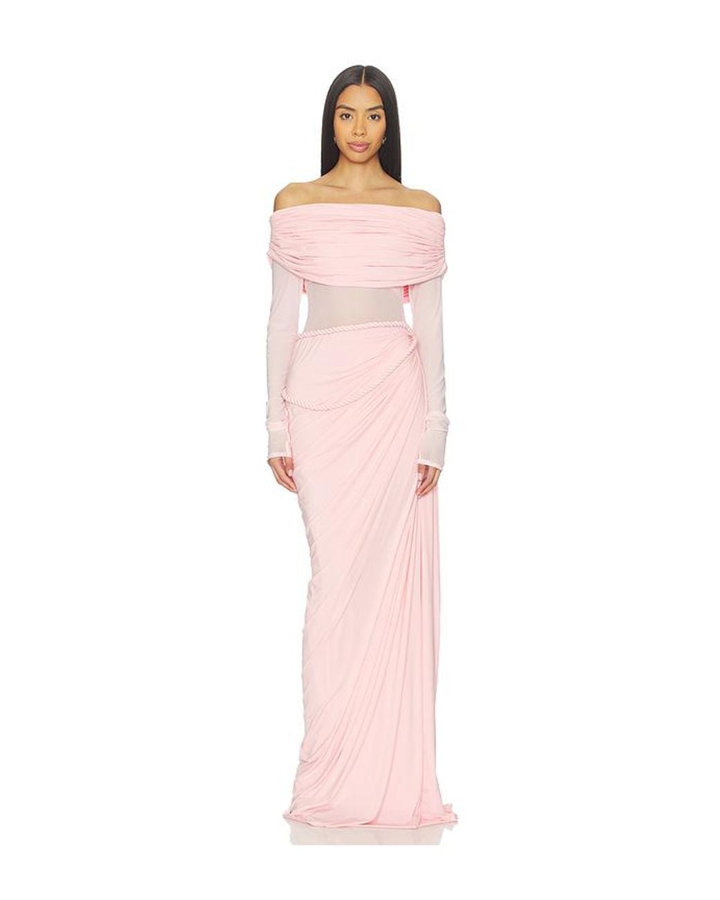 Deme by Gabriella Bella Dress in Pink. Size M. Also in L, S, XS. Deme by Gabriella Bella Dress in Pink. Size L, S, XS. 80% nylon 20% lycra. Made in India. Dry clean. Lined. Draped detail with rope accent at waist. Chiffon fabric. Off-shoulder design. Neckline to hem measures approx 63 in length. DEBY-WD76. DBG_CP_020.