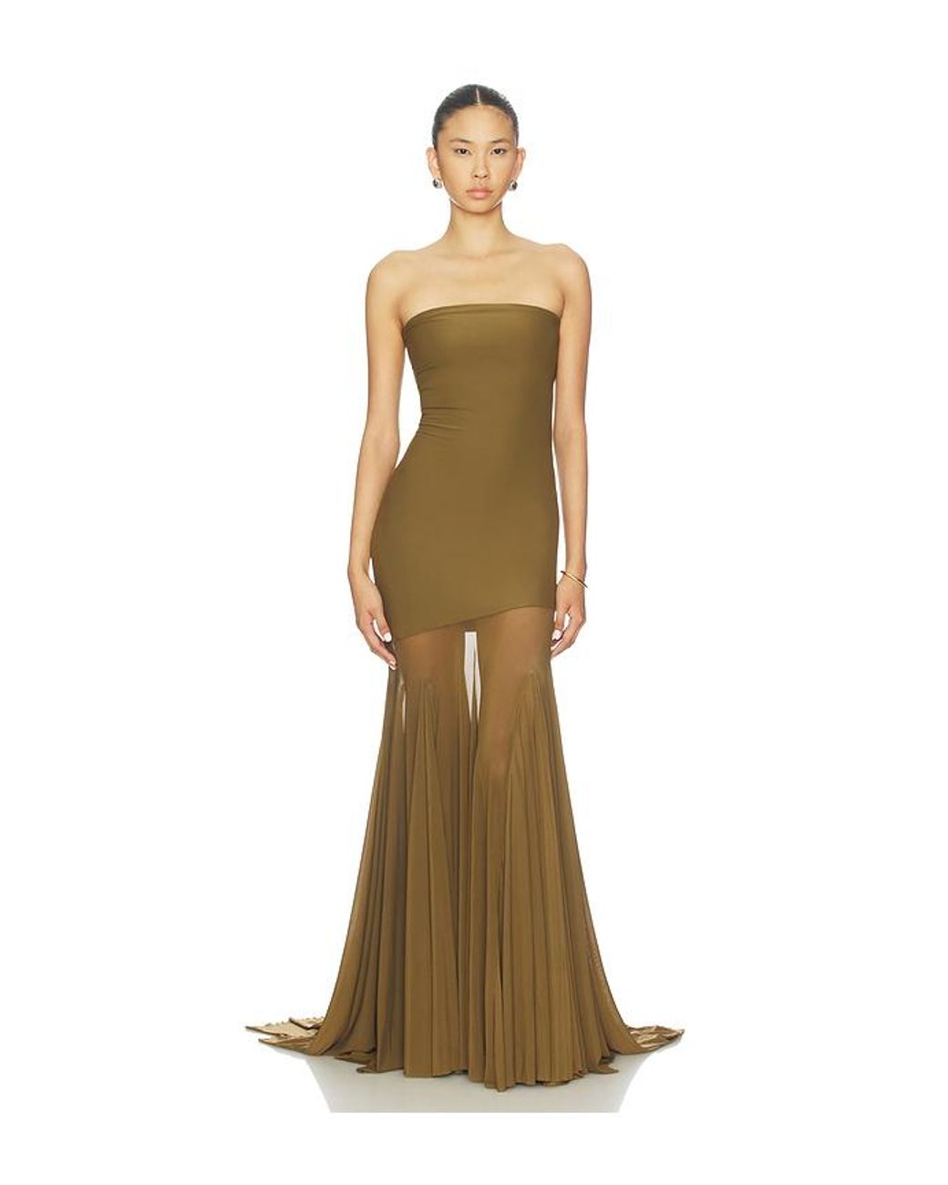 Deme by Gabriella Dahlia Dress in Brown. Size L. Also in M, S, XL, XS. Deme by Gabriella Dahlia Dress in Brown. Size M, S, XL, XS. 80% nylon 20% lycra. Made in India. Dry clean. Partially lined. Pull-on styling. Slinky jersey textile bodice with contrast mesh skirt. Laser cut hem. Neckline to hem measures approx 72 in length. DEBY-WD74. DBG_SOL_025.