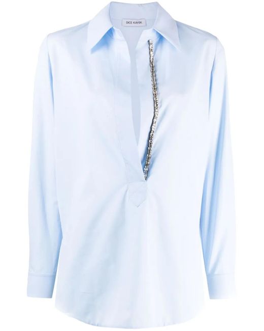 Alice blue cotton poplin texture crystal embellishment classic collar V-neck long sleeves buttoned cuffs curved hem Size: 40. Gender: Female. Material:Cotton. Colour: blue