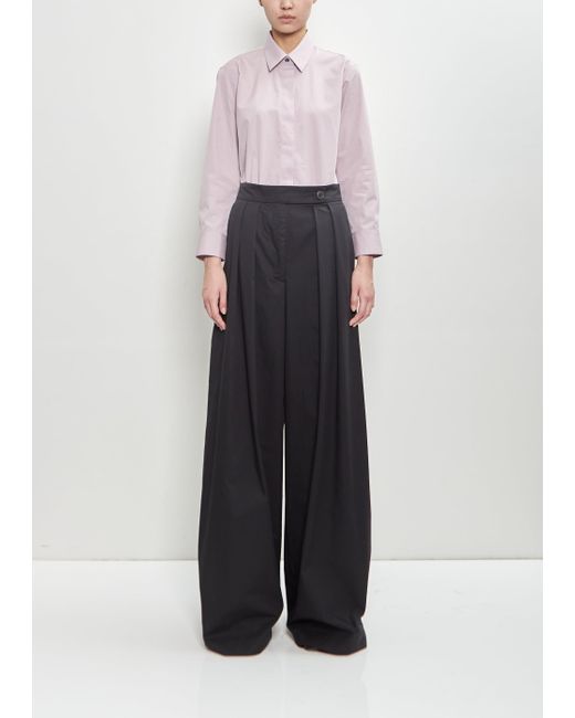 Dries Van Noten signature black wide leg trousers with front pleats in mid-weight cotton twill. Features a long inseam, high rise fit, angled side pockets, and a concealed zip fly with an extended waist tab and single button fastening. Worn with: Cotton Clavini Bis Shirt — Lilac. And. Heeled Loafer. Sizing: European (34-40). 34=XS, 36=S, 38=M, 40=L. Danelya is 5' 9.5" (177cm), bust 30.5", waist 22.5", hips 34.5" and wears a size 34. 100% Cotton. Colour: black
