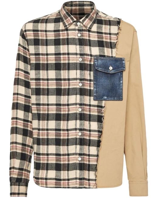 Sand beige patchwork design distressed finish plaid check pattern classic collar front button fastening long sleeves buttoned cuffs curved hem chest patch pocket Size: 50. Gender: Male. Material:Cotton/Elastane. Colour: blue