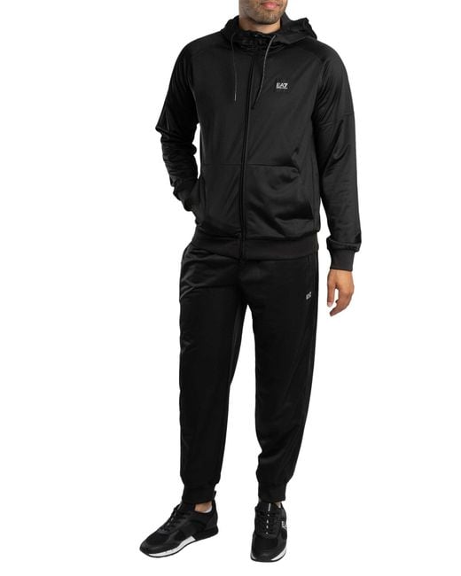 EA7's Gym Zip Hoodie Tracksuit in Black is designed for both comfort and performance. The hoodie features a logo on the chest, a drawstring hood, and open pockets for added convenience. The elasticated cuffs and hem ensure a secure fit, while the branded zip offers a touch of luxury. The joggers complete the look, with a drawstring waist, logo on the front, and elasticated ankles, making this tracksuit perfect for the gym or casual wear. Colour: black