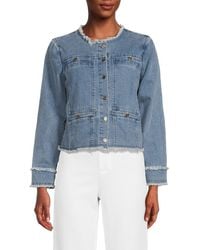 Go to Saks OFF 5THWoven with a richly textured cotton-blend, this mixed-media tweed jacket from Ecru features denim trim accents and a polished button front for a contrast look. Crewneck Long sleeves Button front Denim trim at