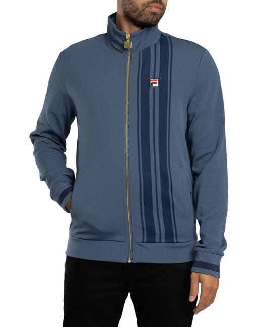 The Fila Dante Printed Stripe Track Jacket in Indigo Navy is a retro-inspired layer with bold detailing. Featuring an embroidered logo on the chest, it blends classic sportswear with everyday versatility. A branded zip secures the front, while elasticated cuffs and hem provide a snug fit. Open pockets offer functionality, making this jacket practical as well as stylish. Its striped design brings back heritage flair, staying true to Fila's archive-inspired approach. Colour: blue