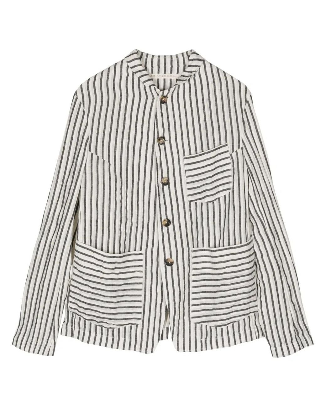 White/grey linen-cotton blend vertical stripe pattern band collar long sleeves with buttoned cuffs chest patch pocket dart detailing two front patch pockets straight hem front button fastening Size: 42. Gender: Female. Material:Cotton/Linen/Flax/Cotton/Silk. Colour: white