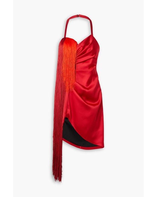 Women's Red Draped Fringed Duchesse-satin Halterneck Mini Dress
