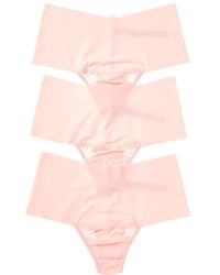 Go to Rue La LaAbout the brand: Signature lace design famously described as butter. Color/pattern: Himalayan pink/pink lady/taupe Body: 100% nylon Trim: 90% nylon, 10% spandex Lining: 100% Supima cotton Hand wash Imported Contents of Set: 3 thongs Colour: red