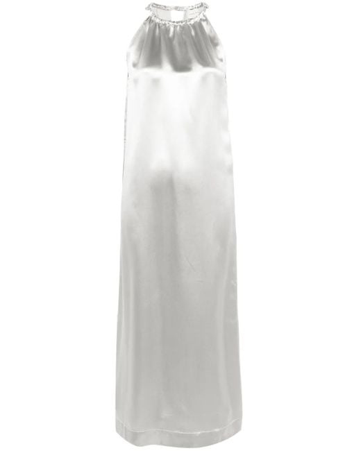 Grey silk blend satin weave metallic effect ruched detailing halterneck keyhole detail to the rear sleeveless side slits ankle-length straight hem unlined single rear button fastening concealed side zip fastening Size: XS. Gender: Female. Material:Silk/Viscose.