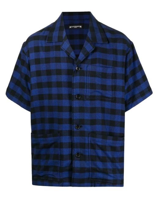 Blue/black cotton plaid check pattern embroidered logo to the rear skull embroidery to the rear camp collar short sleeves front button fastening Size: M. Gender: Male. Material:Cotton. Colour: blue