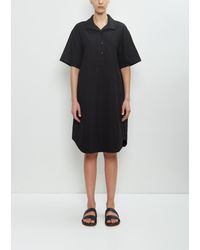 Go to La GarçonneMHL by Margaret Howell uniform blue shirt in Italian cotton poplin. Features a classic collar, chest patch pocket, deep stitch cuffs, side split hem, and corozo brace button front. Relaxed fit. Worn with: