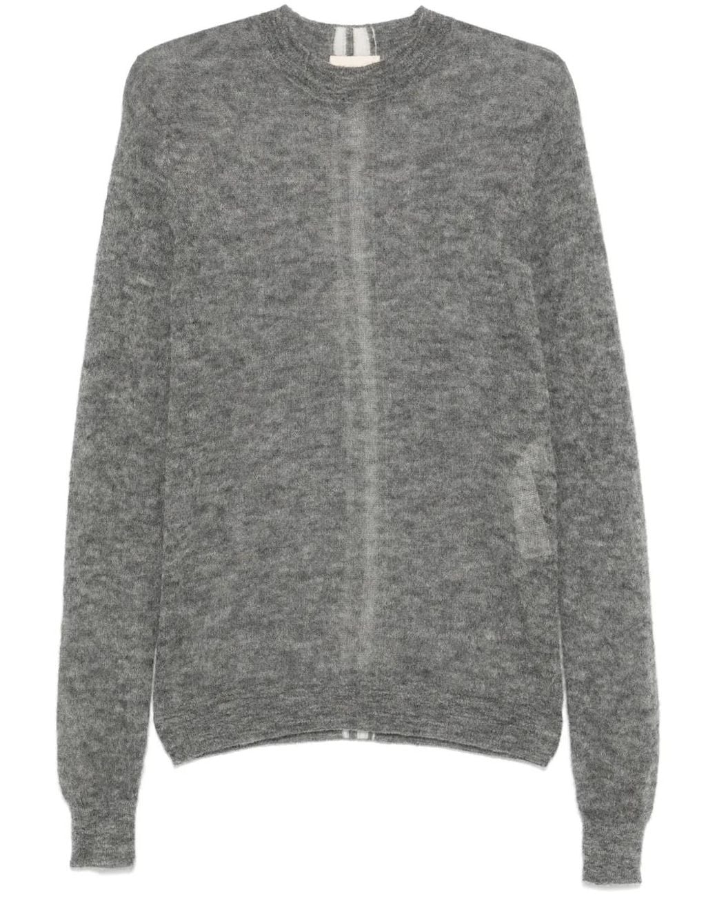 Medium grey virgin wool-cashmere blend fine knit mélange effect semi-sheer construction crew neck long sleeves stripe detailing to the back ribbed cuffs and hem Size: M. Gender: Male. Material:Virgin Wool/Cashmere. Colour: grey