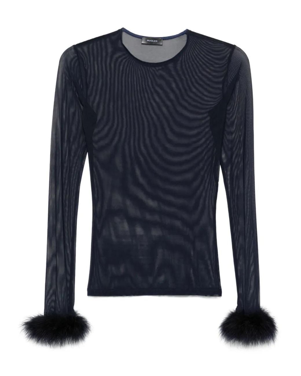 Ink blue mesh fabric long sleeves round neck feather cuffs Size: 34. Gender: Female. Material:Elastane/Recycled Polyamide/Feather.