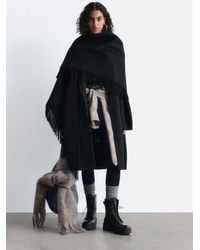 Go to & Other StoriesCrafted from a soft wool blend in structured doublé, this mid-length coat is cut in a clean silhouette with raglan sleeves. It features a large built-in shawl collar with fringed edges that can