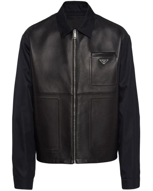 Black leather/recycled nylon panelled design classic collar chest patch pocket enamel triangle logo front zip fastening two side patch pockets buttoned cuffs straight hem Size: S. Gender: Male. Material:Leather. Colour: black