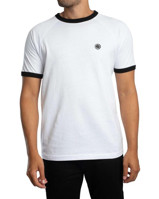 Minimalist yet distinctive, the Pretty Green Boston Ringer T-Shirt in white stands out with its embroidered logo on chest and bold contrast edging on the elasticated collar and elasticated sleeves. Cut in a regular fit with a straight hem, it offers a flattering, easy-to-style shape. The soft cotton fabric feels comfortable against the skin, making it ideal for year-round wear. True to Pretty Green's style ethos, it's a timeless staple that can be paired effortlessly with jeans, chinos, or shorts. Colour: white