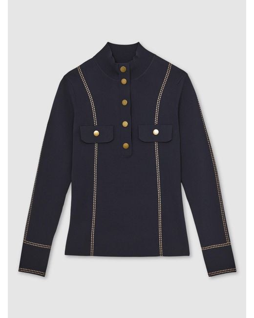 The Eva knit top is cut to a slim fit, with a hint of stretch for comfort. A high neckline and long cuffed sleeves create a sophisticated feel, elevated by contrast stitching and metal buttons at the placket opening and pockets. High neckline. Contrast stitching. Flap pockets. Front buttons. Hand wash only. 54% Viscose, 45% Nylon, 1% Elastane.