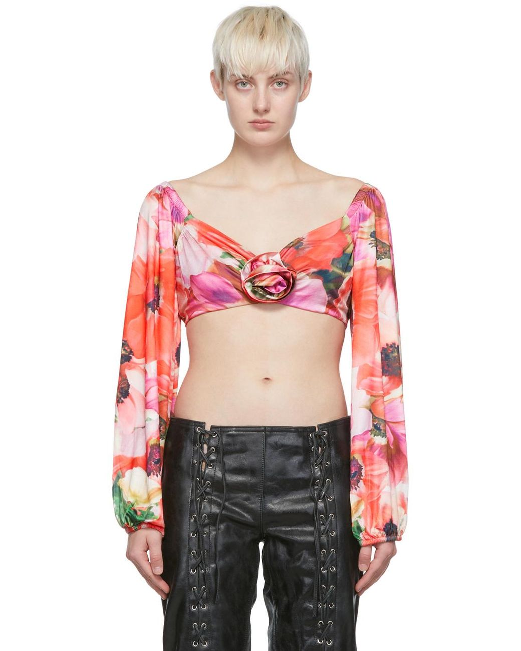 Stretch acetate jersey blouse. Floral pattern printed throughout. · Sweetheart neckline · Handcrafted graphic accent at front · Puff sleeves · Elasticized cuffs and hem Supplier color: Flower nuances