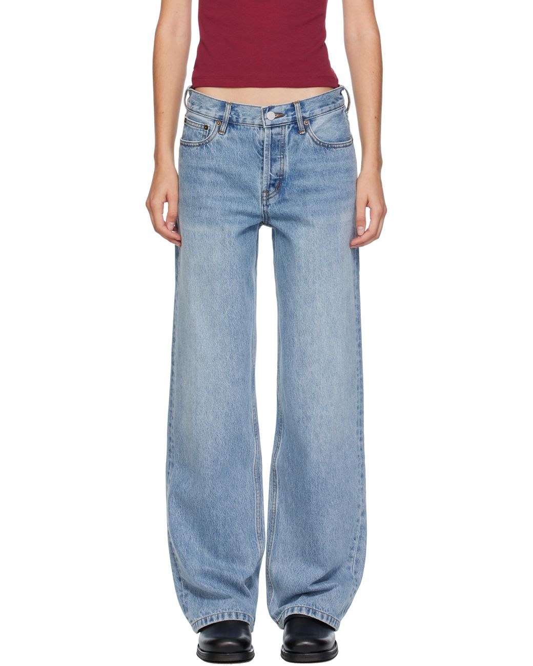 Non-stretch denim jeans. · Straight-leg · Fading and whiskering throughout · Belt loops · Five-pocket styling · Button fly · Logo embroidered at back waist Supplier color: 1962 Colour: blue