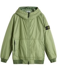 Go to BaltiniHooded jacket in nylon. Down jacket with hood made of recycled nylon. The inner resin coating makes it wind-resistant, giving it a crumpled appearance. It has two pockets, internally elasticated cuffs, and a