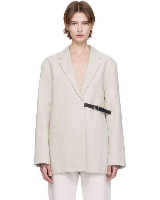 Cotton-blend twill blazer. · Wrap construction · Notched lapel · Concealed single-button closure · Cinch belt at waist · Seam pockets · Padded shoulders · Button fastening at cuffs · Central vent at back hem · Fully lined Supplier color: Dove Colour: natural
