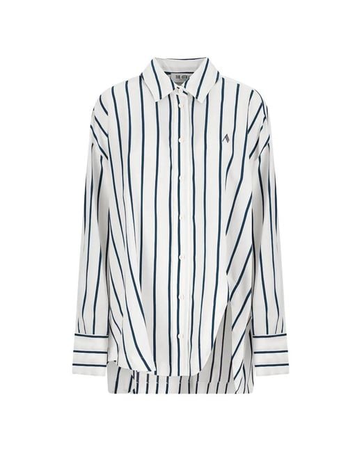 White/blue striped pattern button fastening logo detail long sleeves buttoned cuffs classic collar asymmetric hem Size: 38. Gender: Female. Material:Viscose.