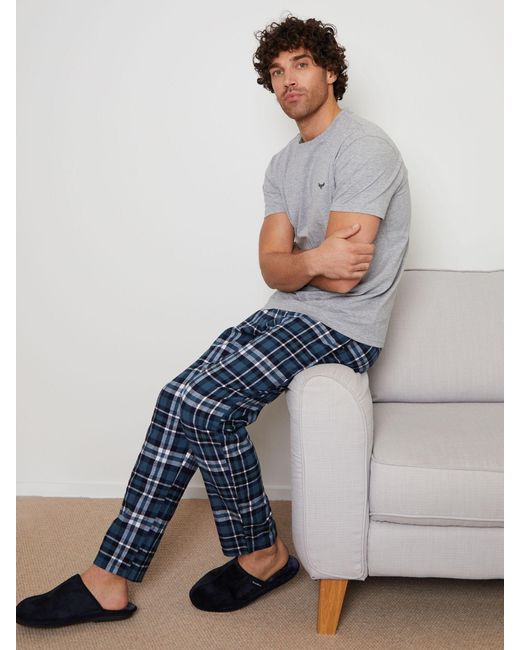 Lounge in comfort with this two piece pyjama set from Threadbare. 2-piece set. Short sleeve top. Embroidery on chest. Ribbed crew neck. Brushed check bottoms with elasticated waistband and drawcords. Side entry pockets. 90% Cotton, 10% Viscose. Colour: white