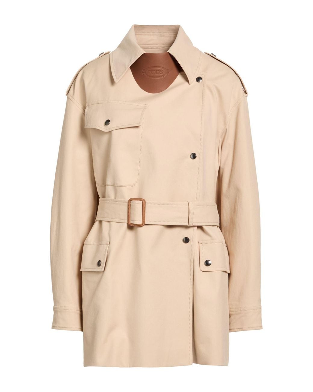 Trench coat Woven Stretchy fabric Solid colour with appliqués Leather trims Detachable application Belt Double-breasted Long sleeves Fully lined Snap fastenings Flap pockets Contains non-textile parts of animal origin Do not wash Do not bleach Do not tumble dry Colour: natural