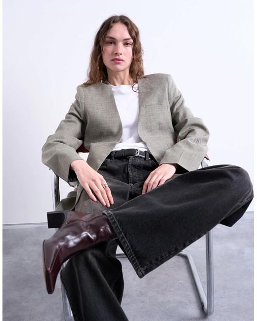 Blazers & Suit Jackets by Topshop This blazer is crafted from woven fabric with a checked print. With a collarless design, this style features long sleeves and pocket details and is cut to a regular fit. Colour: grey