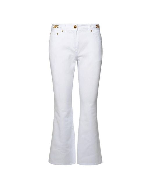 Versace Ladies Bottoms. Fashion category: Jeans & Denim. SKU: 1014103_1A08570. Color: White. Versace White Cropped Flared Jeans Flared, non-stretch denim jeans featuring a zip-fly, belt loops, and classic five-pocket styling. Finished with a leather logo patch at the back waistband and logo-engraved gold-tone hardware. Composition: Body: 100% Cotton; Trim: 100% Calf Leather; Lining: 65% Polyester, 35% Cotton. Made in Italy. Colour: white