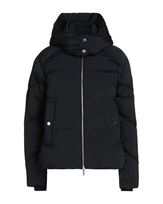 Down jacket, shell, quilted, stretchy fabric, brand logo, solid color, detachable hood, long sleeves, duck down filling, heavyweight padding, zipper fastening, slit pockets, internal pockets, contains non-textile parts of animal origin, machine wash or dry clean, do not bleach, do not tumble dry, this item contains down or feather sourced from farms where animal welfare is valued, this brand runs small. 91% Polyamide, 9% Elastane.