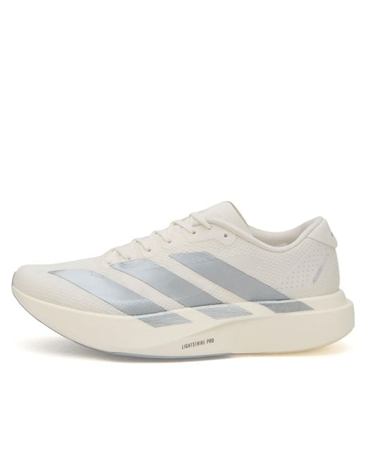 Adidas Running ADIZERO Evo SL woven sneaker channels the same boundary‑pushing spirit as the Pro Evo 1, reworking that race‑day DNA into something lighter, sharper and built for everyday speed. The streamlined upper and bold, track‑inspired detailing give it a fast aesthetic even when you’re standing still, while the LIGHTSTRIKE PRO midsole delivers energetic cushioning that keeps transitions snappy. With a neutral platform, 7mm drop and a featherweight 224g build, the ADIZERO Evo SL is engineered for racing yet effortless enough for daily miles. Suitable for Road Running, Synthetic & Textile Uppers, LIGHTSTRIKE PRO Foam, Adizero Technology, 7mm Heel Drop, Lace Up Closure, Branding Throughout, Style Code: KI6928, Shop All Women's adidas Sneakers, Shop All Women's Sneakers. Adidas Running Women's Adidas Adizero Evo SL Woven Sneaker in Core White/Halo Silver, Size UK 3.5 | END. Clothing