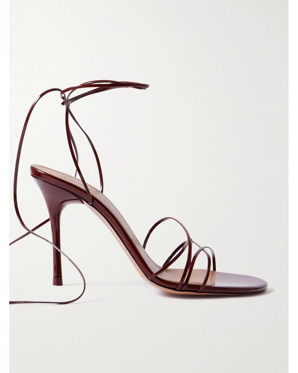 Amina Muaddi's 'Lori' sandals have slim straps that elegantly wrap around the ankles. They've been crafted in Italy from patent-leather and rest on stiletto heels that offer 95mm of lift. Colour: red