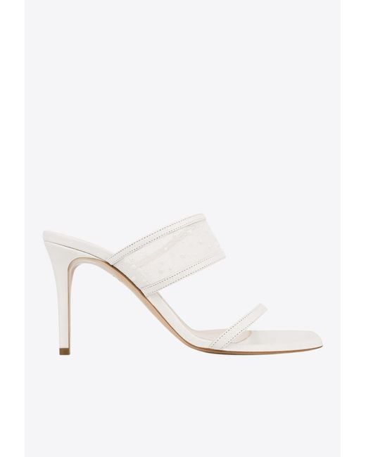 Material: 100% leather, 100% mesh , 100% pearl. Open square toe. Slip-on style. Thin leather toe strap. Thick mesh strap adorned with pearls on the upper. Leather sole. Made in Italy Colour: white